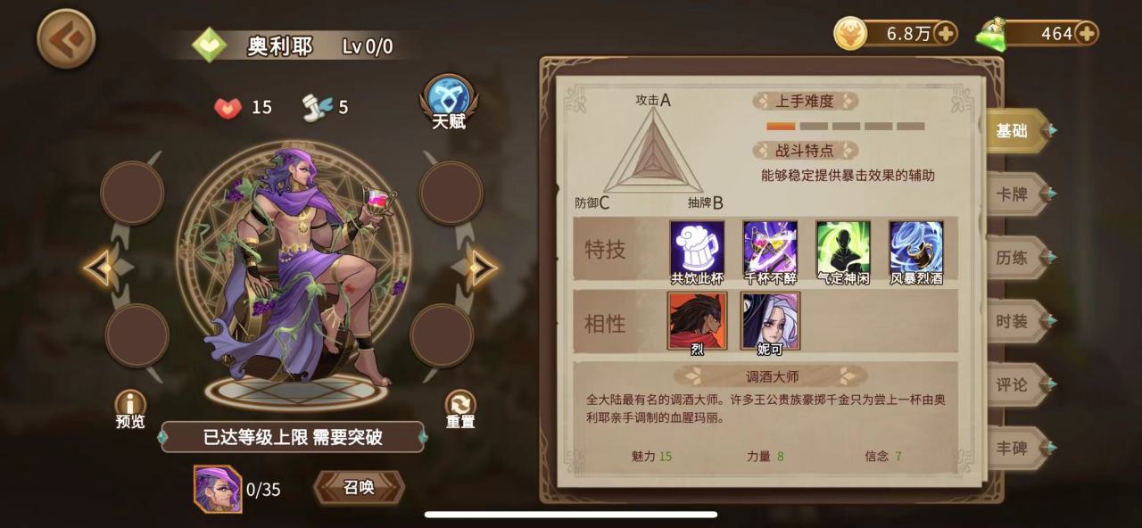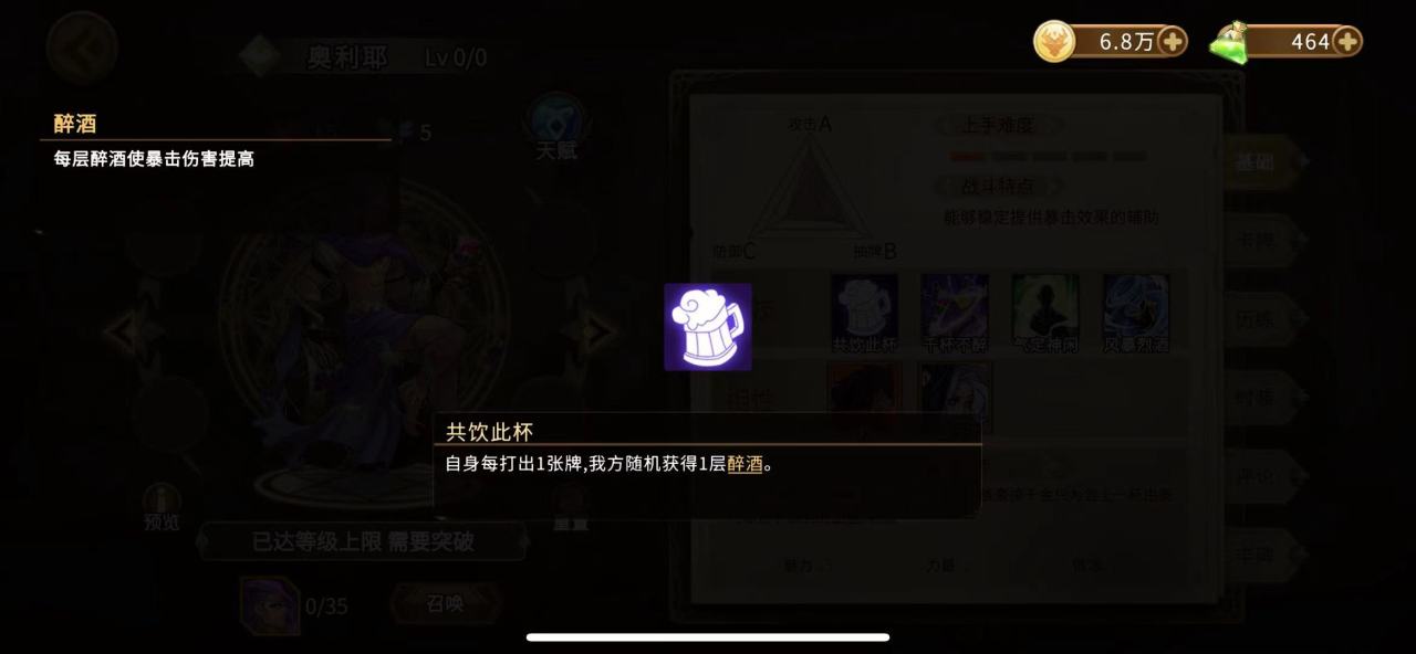 1、奥利耶,橙色级别角色,辅助类英雄,特技共饮此杯,该技能使用之后我方获取一层醉酒状态。
