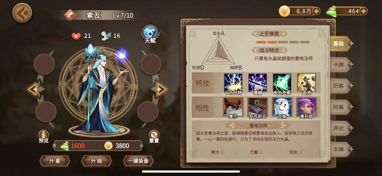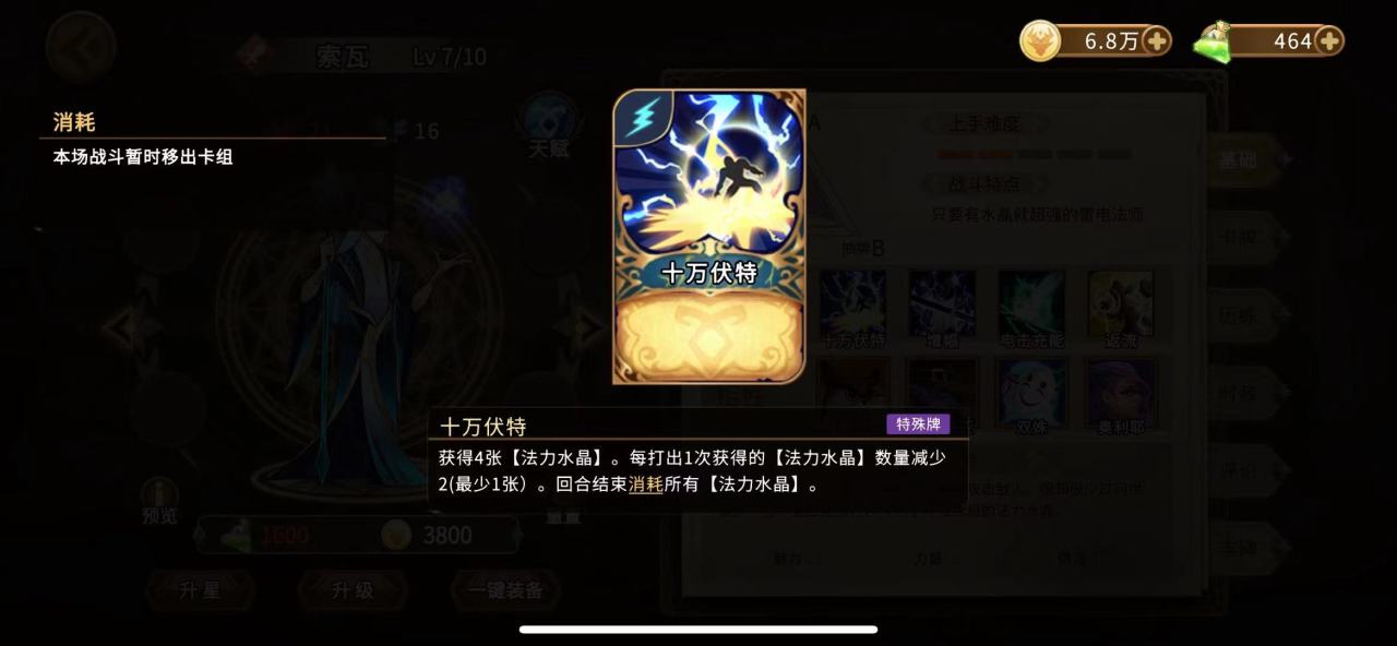 1、索尔,橙色角色,法师类英雄,特技十万伏特,使用该技能之后获取4张法力水晶。