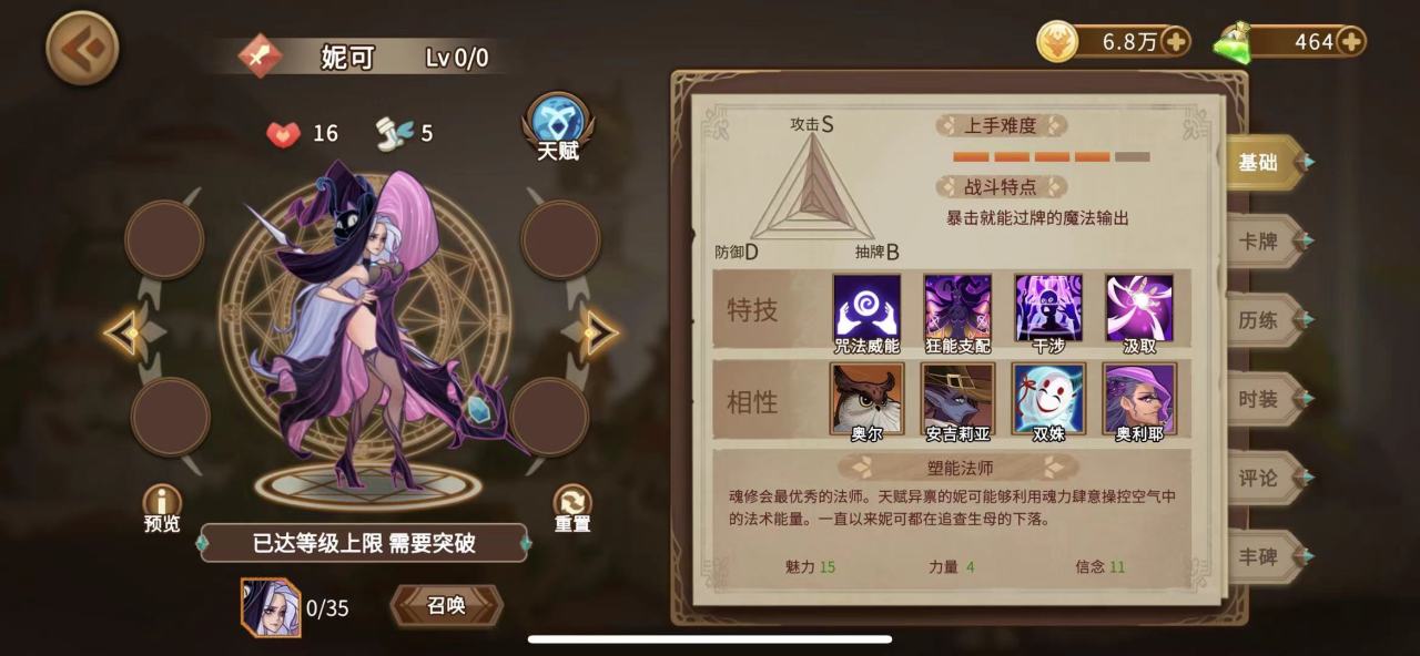 1、妮可,橙色角色,特技咒法暴击,该技能使用之后战斗回合法术攻击暴击之后可以再次获取一张手牌。