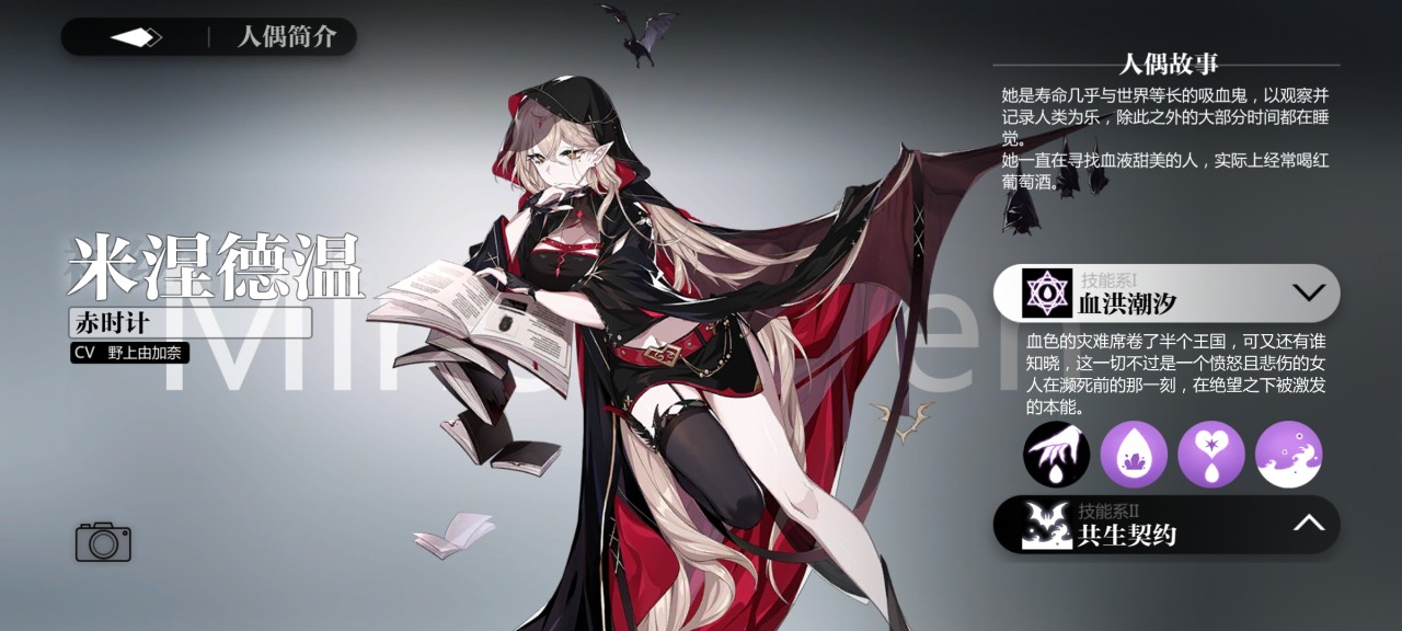 解锁之后,提升好感度主要靠:送礼物和实物来提高。在关于米涅德温的情报中:大部分时间都在睡觉,对自身的事情不怎么在意,寿命和世界等长作为吸血鬼,她观察和记录人类为了,无聊的时候写小说,喜欢甜美的血液但是喝的是红葡萄酒。