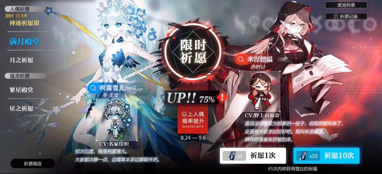 当然了,随着游戏的更新和后面我们人偶的培养,这些概率和新的卡池还会不断出现,不过玩家们不用担心氪金抽卡的问题,因为任务和平时奖励足够玩家们去抽卡了,不氪金也可以抽到属性很好的人偶来慢慢培养!