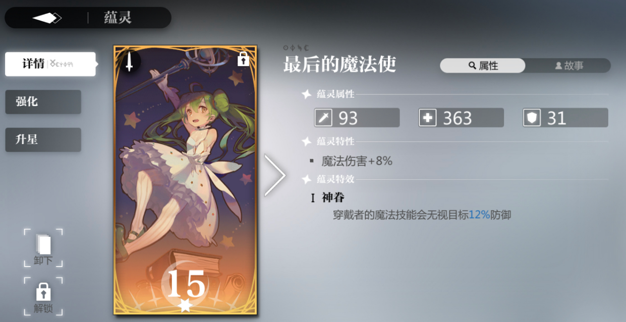 可以使用最后的魔法使这张蕴灵来获得魔法伤害的加成,这是一张非常优秀的魔法输出蕴灵,虽然评级比王牌低但是功能跟王牌类似。最后的魔法使蕴灵的评级是A,适用人群有叶月雪、艾尼斯、萨提娅和薇姬娜。角色装备上这张蕴灵以后自身的魔法攻击可以无视目标的一部分防御力,能够有效地提高角色的魔法伤害。