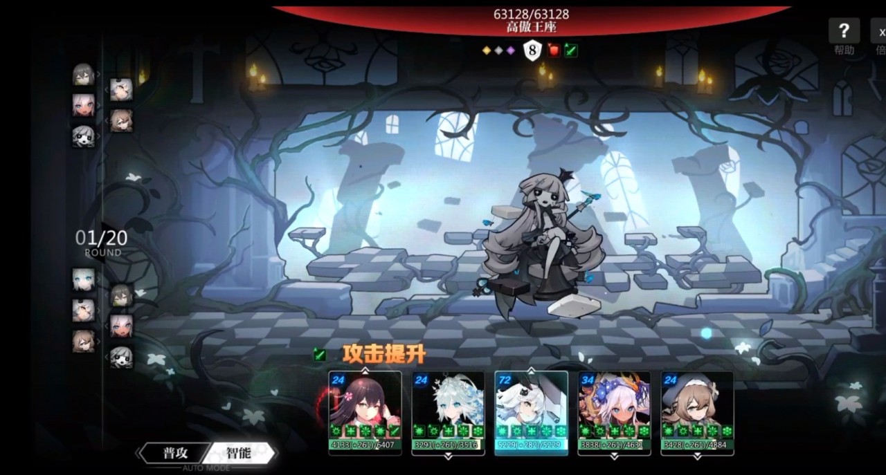 前5回合:尼柯莱特先叠满10层的燃烧,每个回合开始大概掉2W左右的血,这样就可以给boss加上一层流血状态,薇姬娜的奶不要停,有行动力就奶上。