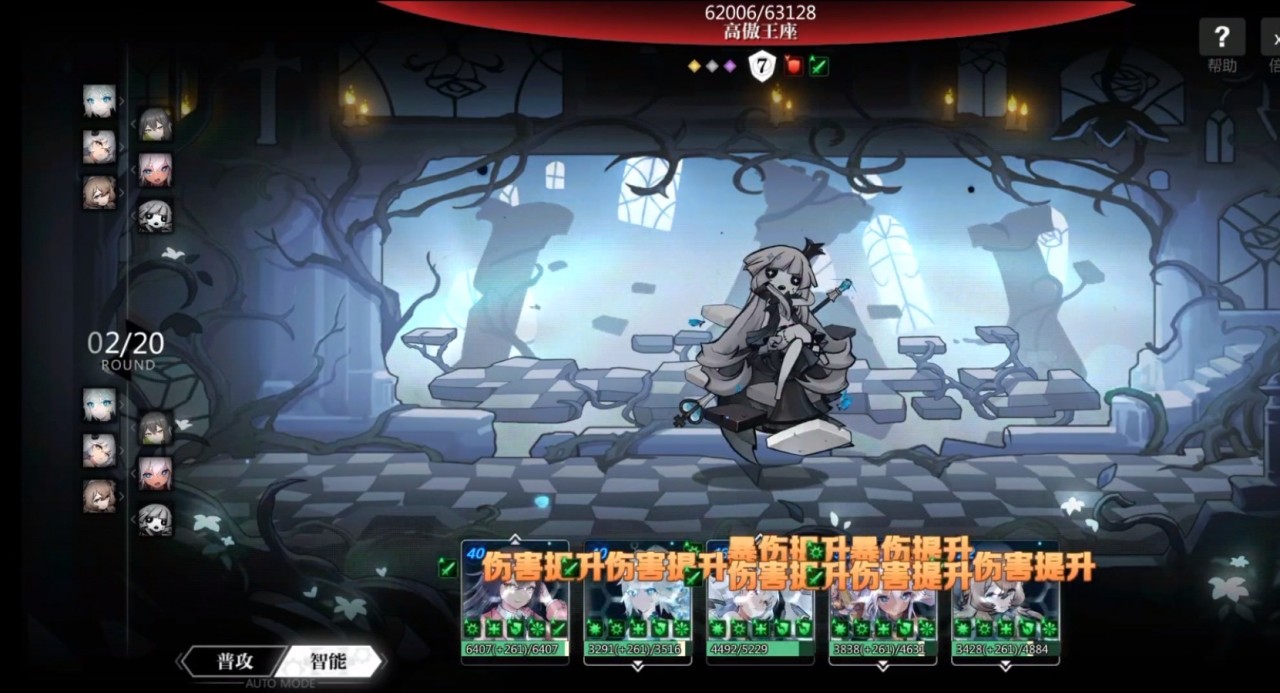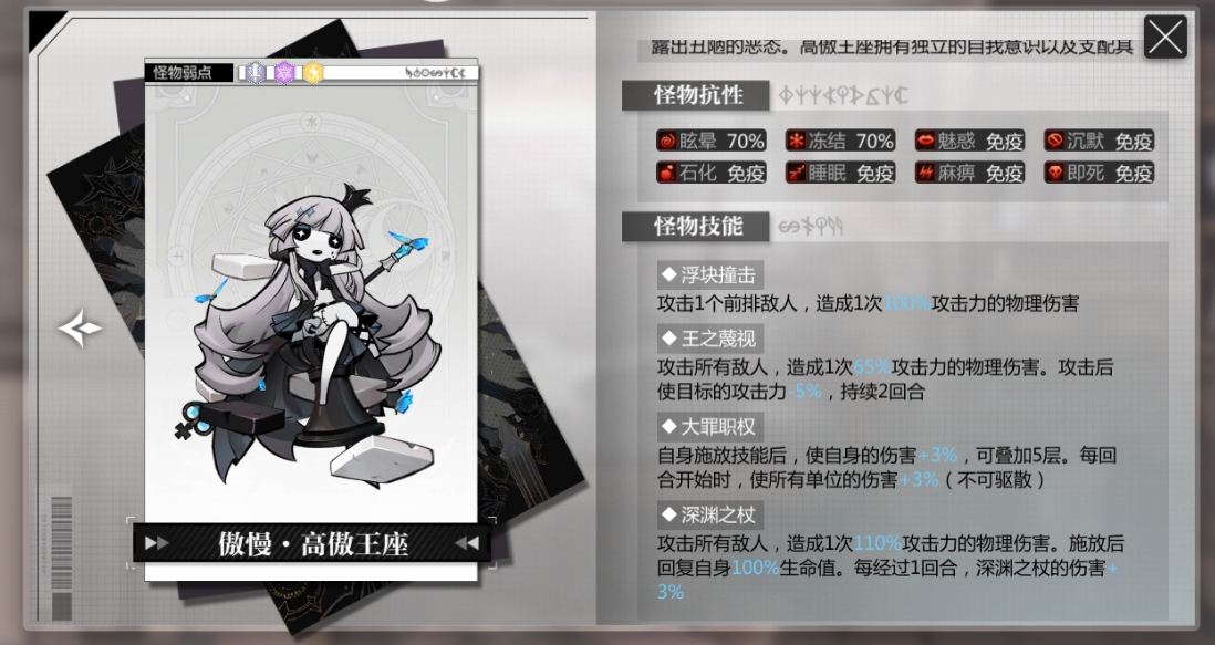 高傲王座的难点在于他会无限吸血,好不容易打到半管血,一不注意又让他给回满了,通过回血来消耗我方队伍。所以打高傲王座boss最关键在于能够打断boss的回血或者让他不回血,那么带一个有控制技能的角色就非常有必要了。