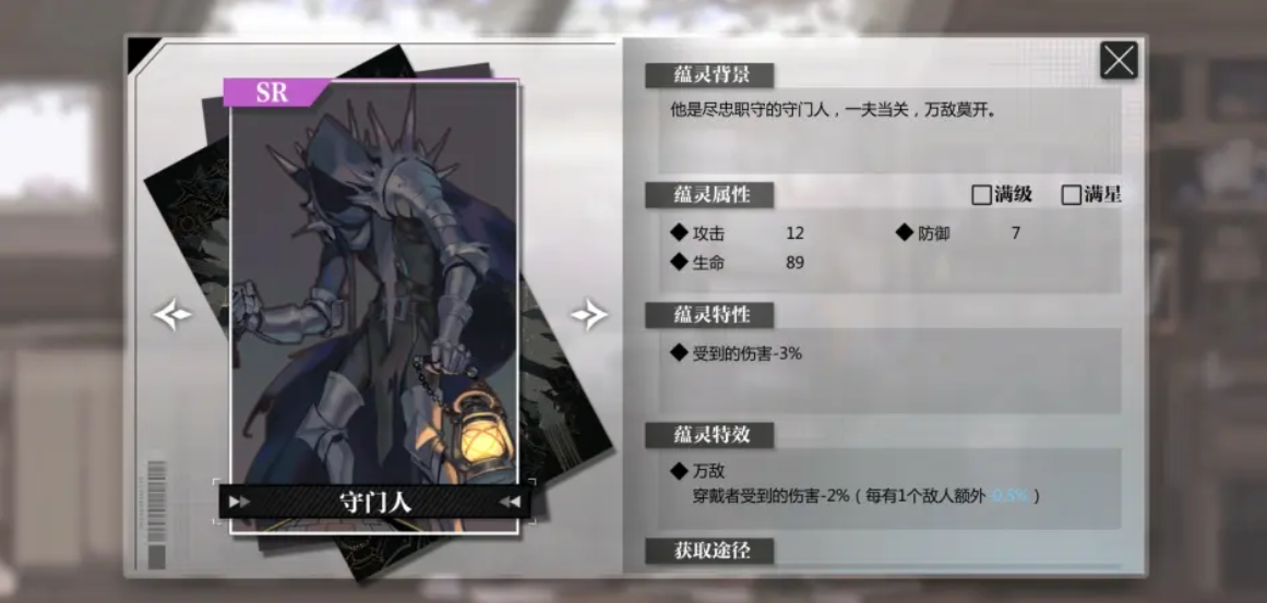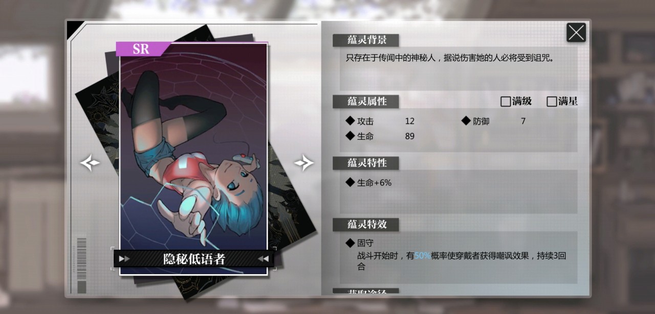 可以增加生命值,然后附带一个概率效果有几率在开局中,使人偶附带一个三回合嘲讽的Buff状态。属于偏功能防守型的蕴灵,可以让坦克来携带者蕴灵,具有嘲讽的前排可以非常好的保护我方的输出,至少能保证三回合的抗输出能力,获得嘲讽的概率,根据星级数增加,升到四星后能获得100%的概率,所以如果前期有资源,可以稍微的说一下,是一张前期比较好用的蕴灵,推荐任何前排人偶使用,尤其是花匠,不仅可以获得嘲讽,还可以让花匠的被动技能更快叠好。