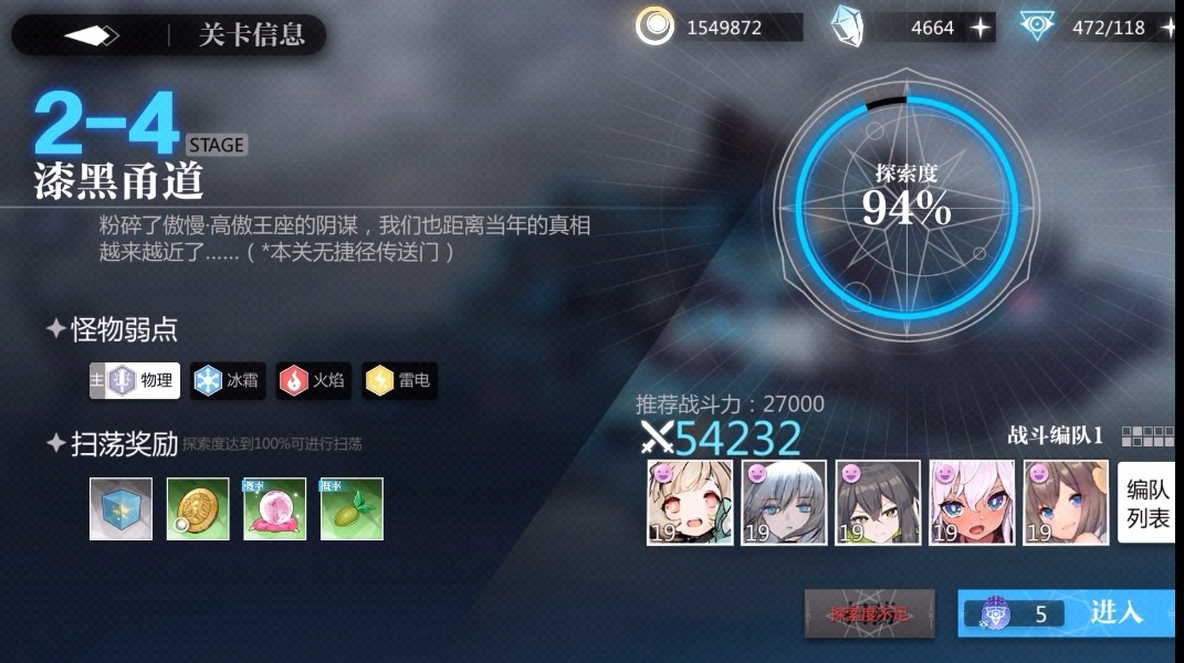 全部放入后,玩家就能开始挑战最终的BOSS啦!这个BOSS的弱点是:物理、冰霜、火焰、雷电,因此玩家如果想要快速通关的话,那么最好要带上这些系别的人偶来进行战斗,除此之外,编队的战斗力还要达到27000,这样才可以顺利通关。
