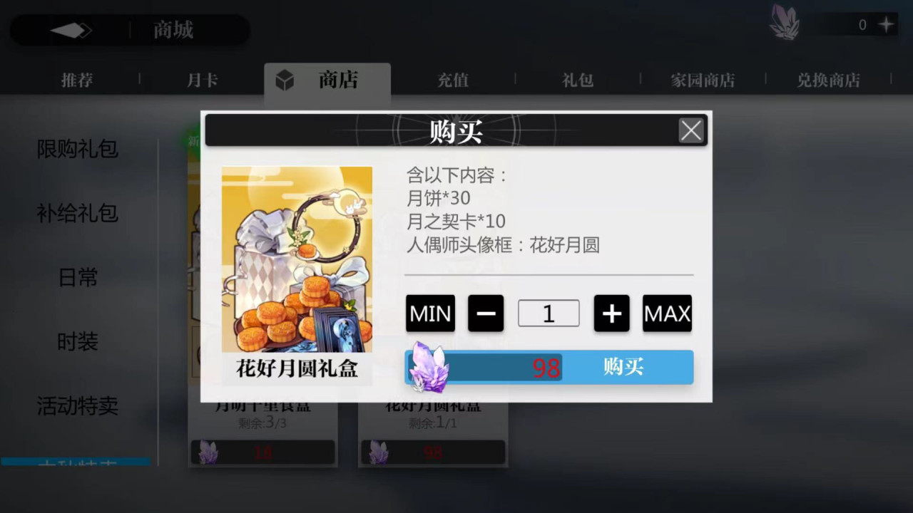 人偶食物可以通过商店进行购买获得,在商城中包括各种不同类型的物品,玩家可以通过消耗月石道具购买食物或通过消耗月萃道具进行购买,当成功购买后,可以在仓库中成功查询到。