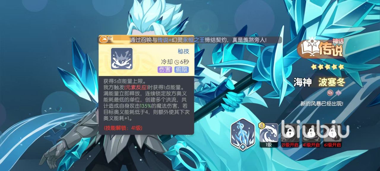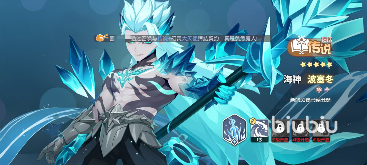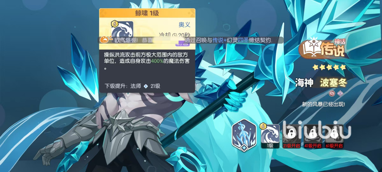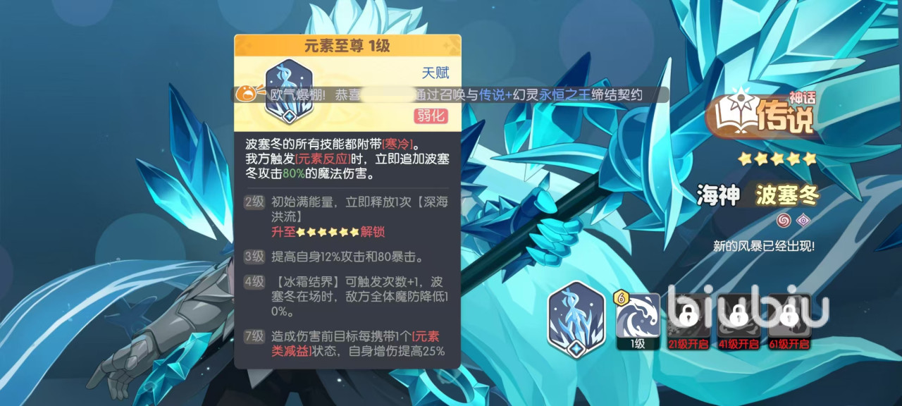 波塞冬的天赋效果是所有技能都会附带寒冷,寒冷是属于一种元素类减益状态,当触发元素反应时,会立即追加波塞冬80%攻击的魔法伤害。通过提高天赋等级,还能获得额外效果,例如提升提高自身攻击和暴击,冰霜结界的触发次数加1,波塞冬在场时,敌方全体魔防降低10%等。奥义技能鲸啸,操控洪流攻击前方大范围内的敌方单位,造成400%自身攻击力的魔法伤害。