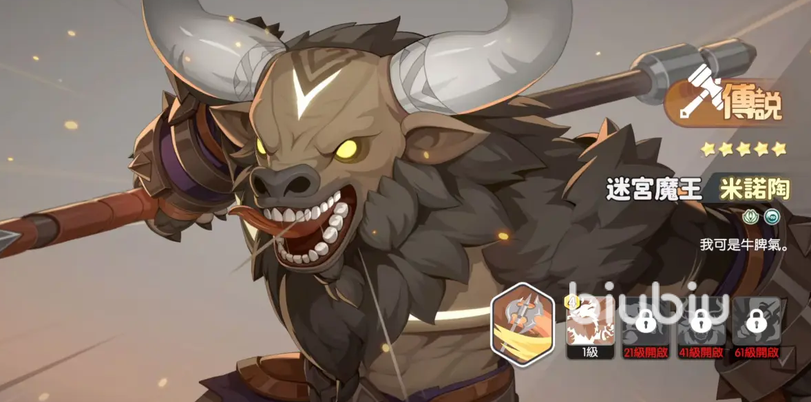 米诺陶是一位战士,他可以奶自己,还自带免控和攻击提高效果,天赋和奥义都带有不成程度的范围控制,使用的过程中还会持续给自己加攻击力,伤害高控场能力又强,推荐大家给他携带攻速装。