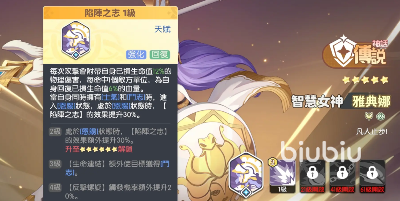 雅典娜是坦克职业的天花板,自身能抗能打,她的被动天赋能在每次攻击的时候附带上自身已损失生命值的额外伤害,并且每成功命中一位就能帮助自己回血,她的奥义有着较大的圆形范围,能造成8秒的范围嘲讽,并生成一个60%血量的护盾,自身血量越少还会加快怒气的获取,“生命链接”能在有队友血量低的时候,帮助提供面伤并分摊伤害,“反击螺旋”能在遭受伤害的时候,有概率进行范围反击,整个角色集坦度、控制、保护伤害为一体,唯一的缺点是培养成本比较高。