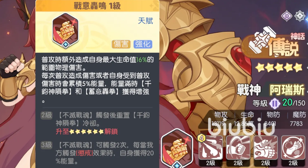阿瑞斯是战士,他有着不错的基础伤害,被动天赋是在普攻时会额外造成范围伤害,每次普攻能帮助积攒能量,并提升技能输出,她的奥义是范围性的,在满能量的时候使用会有非常高额的输出,并且会带有控制能力,“不灭战魂”能在遭受致命伤害时,范围眩晕5秒并消耗能量来补充能量。