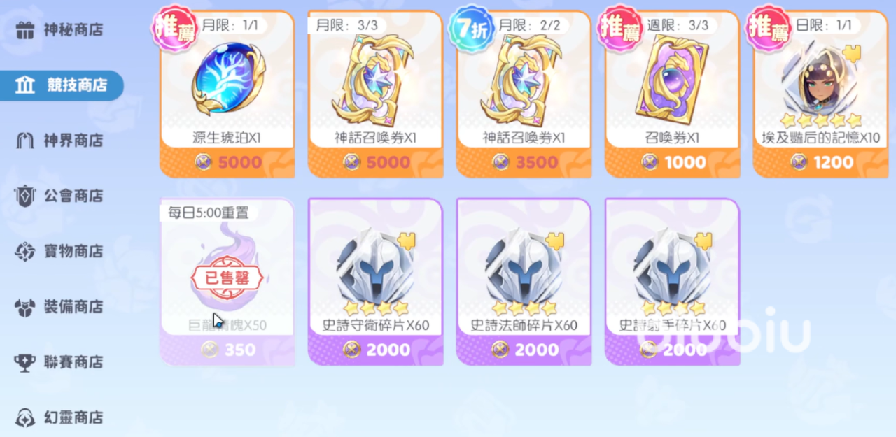 如果大家积极参加竞技场对战的话,那就可以获得各种竞技场货币,只要胜利了之后就能获取荣耀币。这时就可以用荣耀币兑换不同品质的幻灵碎片,例如强大的耶梦加得。然后也能选择兑换竞技场专属装备,进一步提升你的实力。也可直接兑换召唤券,在卡池中抽取你所需要的幻灵。