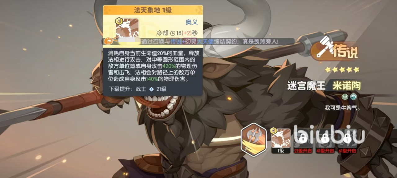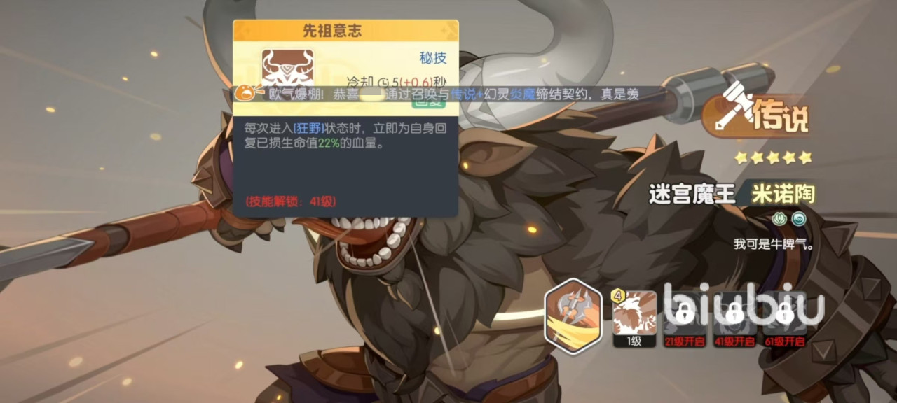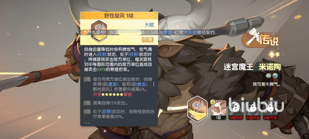 米诺陶的自身天赋是野性旋风,血量降低时会积攒怒气,怒气值满了之后,进入到狂野状态,在此状态下,持续攻击周围敌方单位。另外当我方单位被击败时,米诺陶自身将获得遗言效果,每层遗言可以额外提高旋风的伤害,后续在进行升级时,还有提高攻击力,以及提高自身受到治疗效果的额外附加。