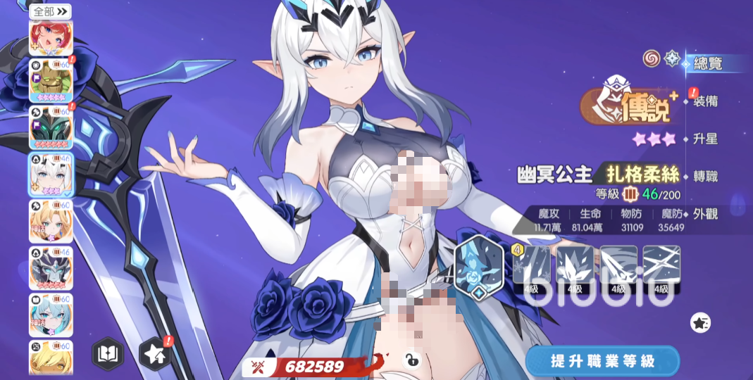 特技”瞬影连斩”,对单体单位展开数次斩击,攻击造成自身攻击力680%魔法损伤,技能时间内,自己是不可被选中状态。她的神格是”幽冥椎雪”,在释放奥义技能时,范围内的敌方目标会被施加“魔防降低”和“攻速降低”效果。