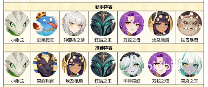 阵容方面最好的推荐就是小幽龙和史莱姆王还有铁胃暴君,都是非常好获取的角色,艳后狂猎等等角色都能依靠up池子获取,对于