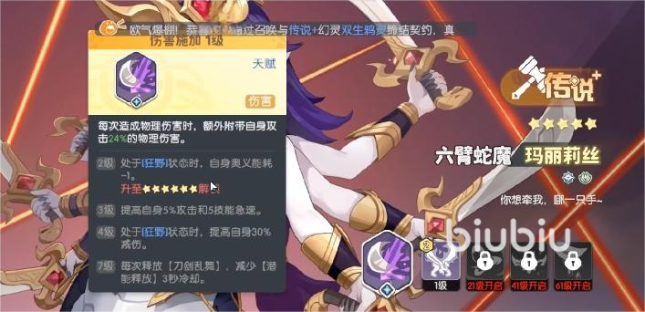 推荐的第一个限定是六臂的蛇魔,该角色叫做玛丽,作为传说级别的限定角色,在前期的时候就是对战的中流砥柱,在狂野状态的时候能够降低自身的奥义的消耗,并且在狂野状态的时候能够增加我方的减伤效果,属于生存和攻击能力兼备的存在,在前期开荒的时候有着无与伦比的实力。