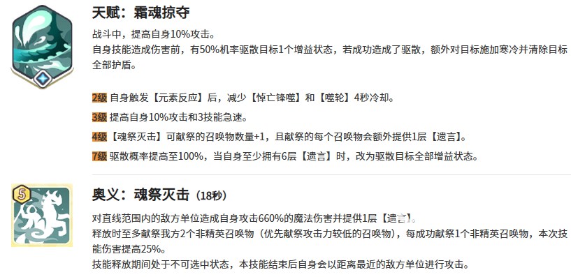 主要的技能是两个秘技,一个可以对没有任何buff的角色造成33%的增伤效果,另一个另一个特技可以对元素减益效果的敌人增加生命转化的效果,配合奥义的的直线范围伤害以及不可选中的效果,对直线的敌人能够早曾毁灭的打击,自身的天赋还有驱散的效果,并且还能献祭掉召唤物强化自己,等到遗言积攒足够的时候可以完全驱散所有的遗言,针对依靠buff站场的敌人基本上就是碾压的局面。