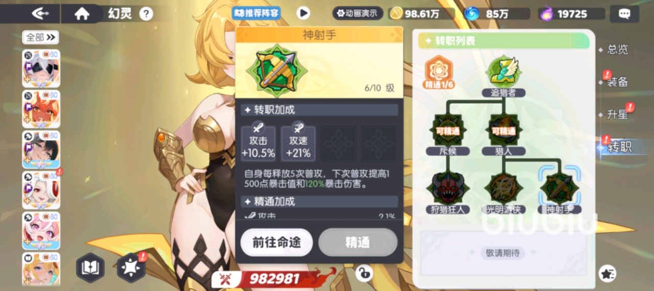 然后是同属于猎人分支的神射手转职,他带来的转职效果是10.5%的攻击加成以及21%的攻击速度加成,每当阿波罗自身释放五次普通攻击的时候,下一次的普通攻击都会获得1500点的暴击提升以及120%的暴击伤害,和光明游侠带来的单次光箭伤害相比,造成伤害的数值比较不稳定,但是在面对血量较多或者数量较多的关卡时会因为叠加伤害而获得很高的属性提升。