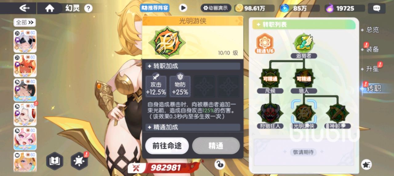 最后是属于斥候分支的狩猎狂人加成,转职加成为提升9.5%的攻击以及19%的物理防御,阿波罗每获得一次增益状态就可以提高他自己3.6%的攻击数值,这个效果最多可以叠加十层。虽然攻击加成远远不如之前两种,但是目前版本中使用人数最多,泛用性最强的一种转职选择,至于攻击力欠缺的部分也可以选择使用装备凑。