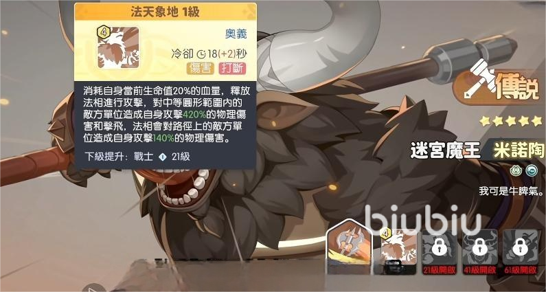 首先推荐的就是迷宫魔王,虽然外形比较的憨憨的,但是皮糙肉厚是它的特点,面对众多的敌人的攻击都能游刃有余坦然面对,法天象地可以消耗自身的生命值的20%释放攻击,本身角色就是一个血牛角色,所以输出的能力非常的可观,对于敌人造成的各方面的输出都是惊人的。