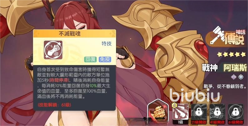 其次推荐战神阿瑞斯,拥有的血量也是非常的多的,除此之外还有不灭战魂特技,能够短暂获取无敌的效果,消耗能量之后就能回复自身的血量,直到回复完全自己的全部血量,是非常强大的控制加回复的手段,免疫效果能够抵消致命的伤害,保证生存。