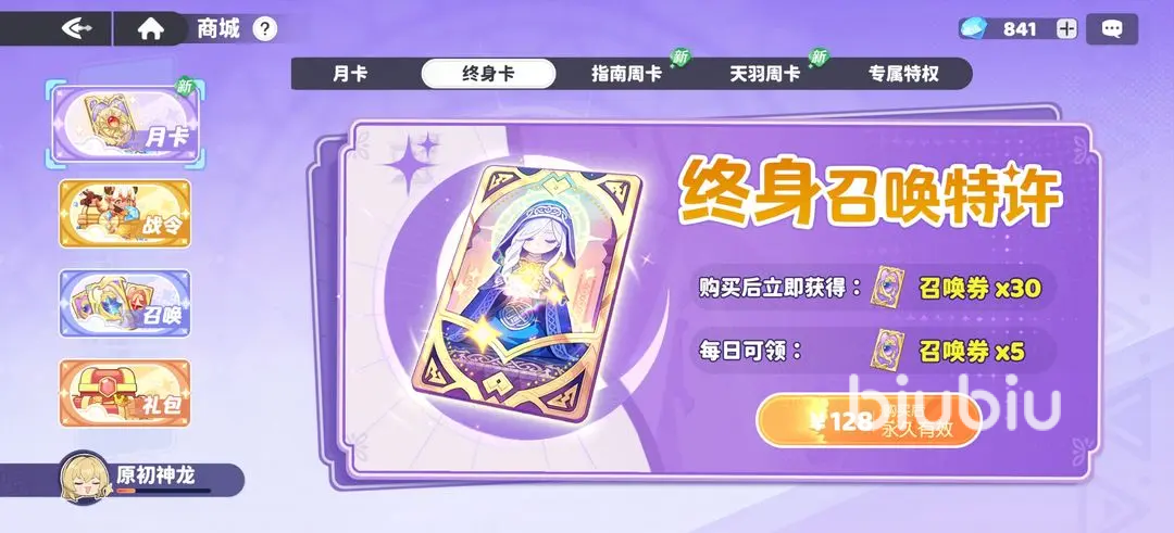 第五个就是终身卡,如果一直打算玩这个游戏,且微氪,那该项目也推荐入手,相对来说还是很值得的,虽然是常驻召唤券,但是每天有5抽,“狗粮”问题得到了很好的解决,很多常驻角色也是很有强度的。