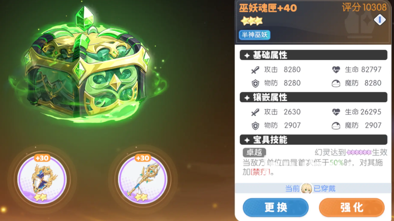 巫妖魂匣为半身巫妖专属,能在敌方血量首次低于50%时对其施加禁疗,极致会在自己在场上,且敌人中了禁疗或治疗降低状态时,额外再降低他的20%攻击。
