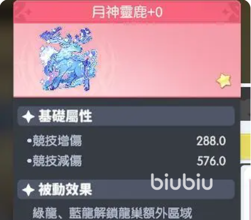 3、月神灵鹿:带来竞技增伤288,竞技减伤576,被动时绿龙和蓝龙能获得龙巢额外的区域,它和大恶魔在增伤减伤方面较大反差。