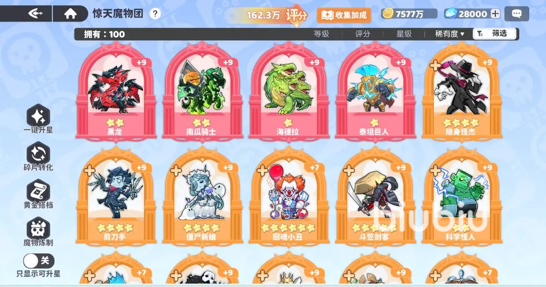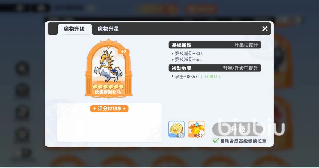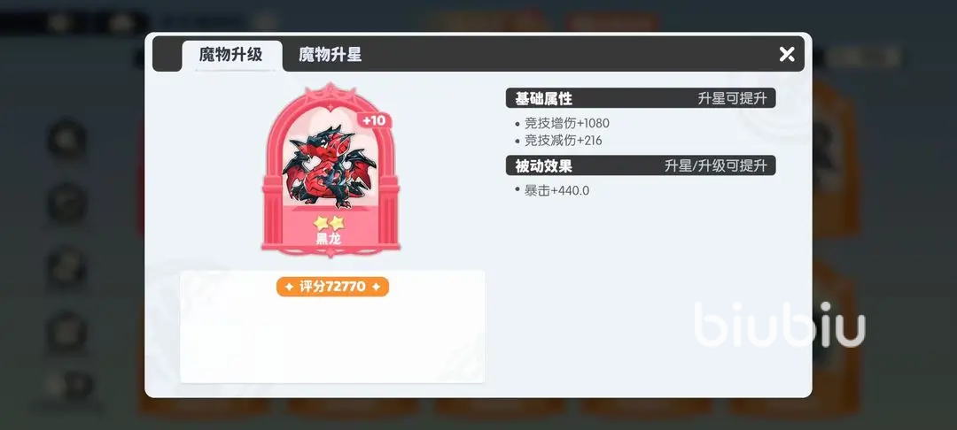 2、升星:星级主要提升竞技属性,升级材料来源于魔物夺宝,不同稀有度有不同需求,低稀有度碎片获取比较简单,反而转化了丰富的合成材料,星级从1星到6星,每一颗星提升10%,最后6星到红星提升30%。