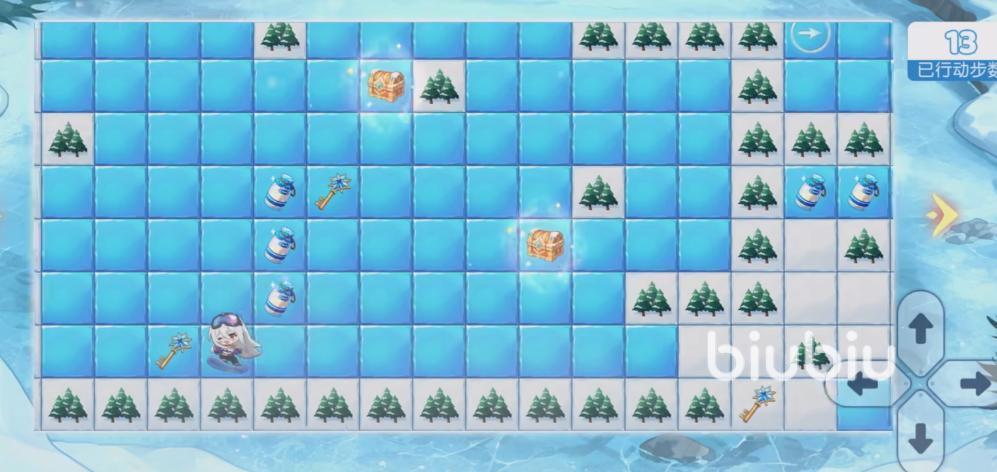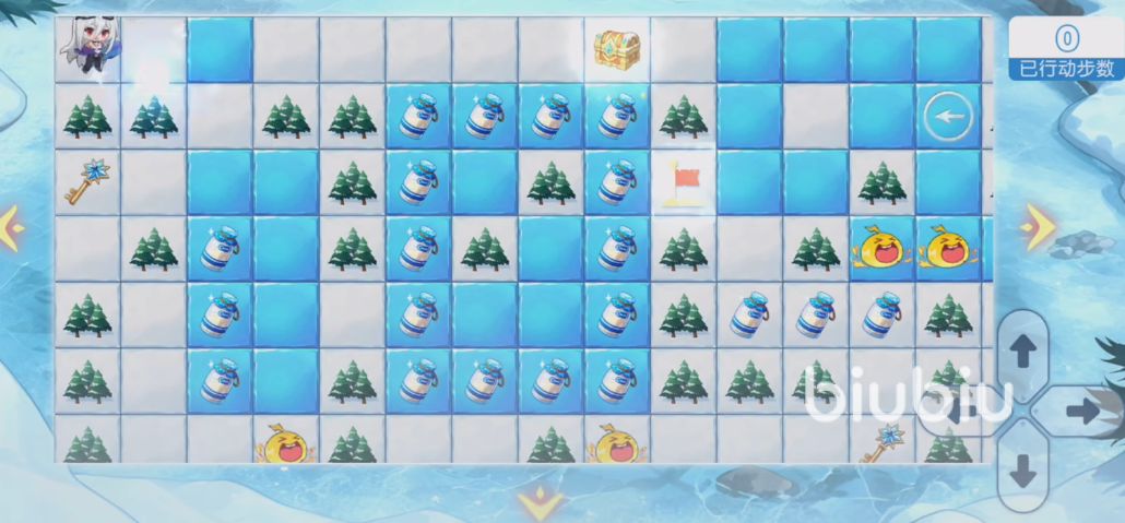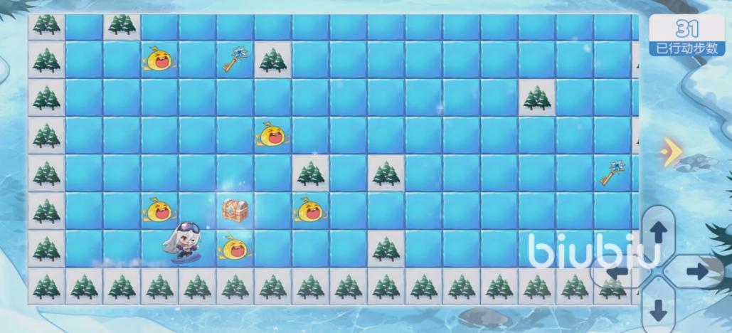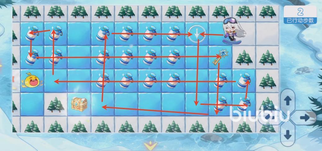 其实并不是很复杂,目标就是消耗尽可能少的步数来完成“奶瓶”的搜集,同时抵达终点。因为冰面很滑,所以当冰面没有阻碍的时候会直接碰到尽头的树上才会停下,第一关大家可以按照这个路线来走。