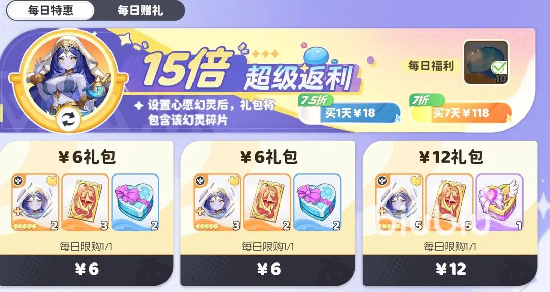 因此大家如果需要加快已经结束的UP限定角色升星速度,这个就是非常值得氪的。接下来就给大家说说每日赠礼,这个项目是不推荐直接购买的,如果有氪金每日特惠,那就能提高价值。