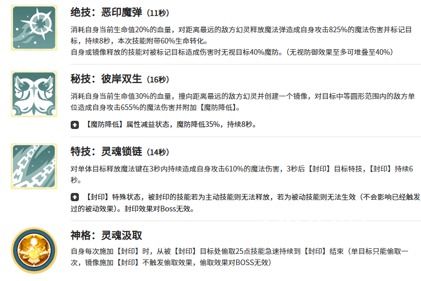 绝技是消耗血量造成的远程伤害技能,秘技是撞击敌人降低魔抗,特技是链条封印的效果,能够封锁敌人的主动技能,所有的技能都是以伤害加控制为主,所以非常的团队化,是刺客法师的必备能力。