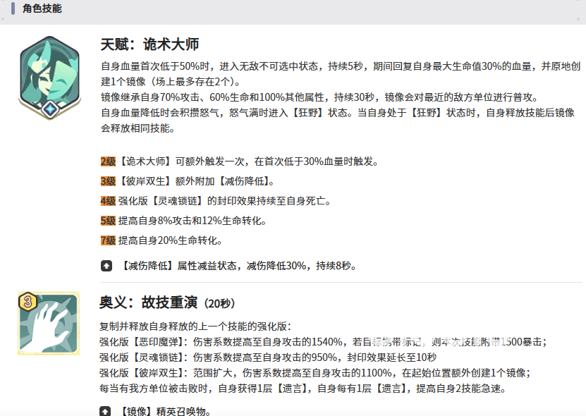 主要的天赋能够创造镜像,并且还是在低血量的时候触发,还能有一段时间的无敌效果,针对玩家的时候会产生许多的影响,这是各位都需要面对的效果影响,针对这个角色无疑是非常有用的,再配合奥义的效果能够多次释放技能打出多段的伤害效果。