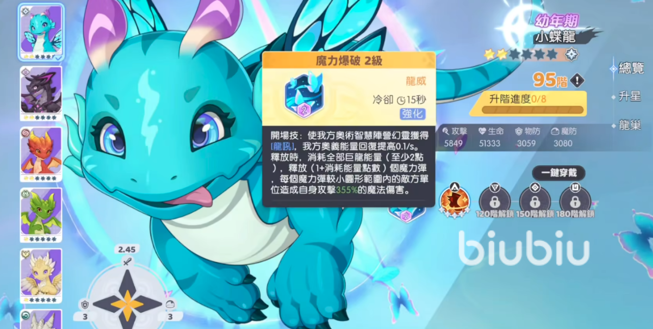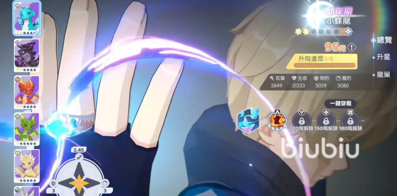 在游戏当中的主角是男主,他的身份其实是一条黑龙。当他处于幼年期时,那就是一只小蝶龙。属于95阶,想要继续升级的话就要不断培养。不过只有通过更多的主线关卡时,才可以突破至更高等级的存在。