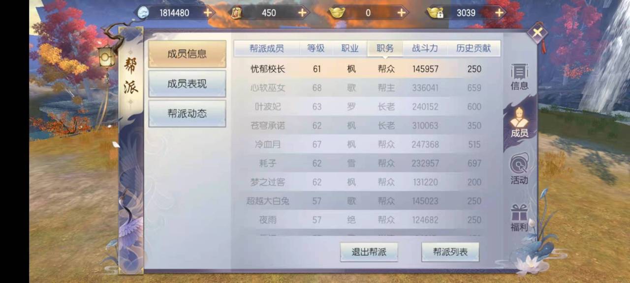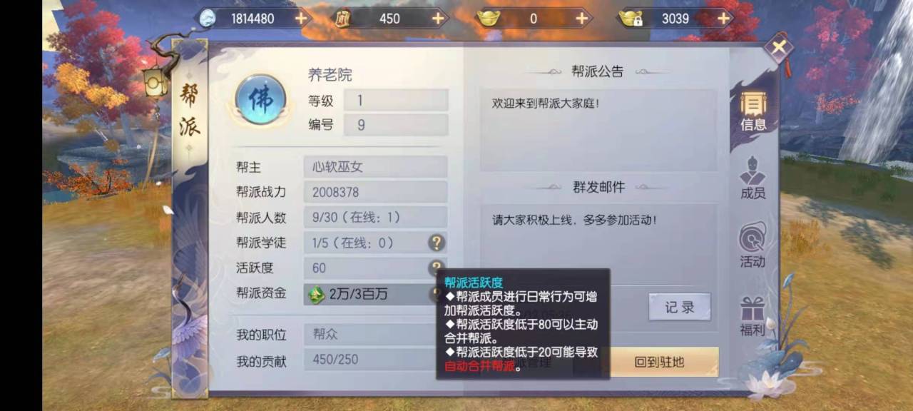 在帮派界面的左下方,可以看到帮派当前的基本信息,其中就包括帮派活跃度,帮派活跃度的作用是当低于80点的时候,就说明帮派处于不活跃状态,就可以选择和其他的帮派进行合并了。当活跃度低于20的时候,就说明帮派已经没有人气了,系统可以强行对帮派进行合并。