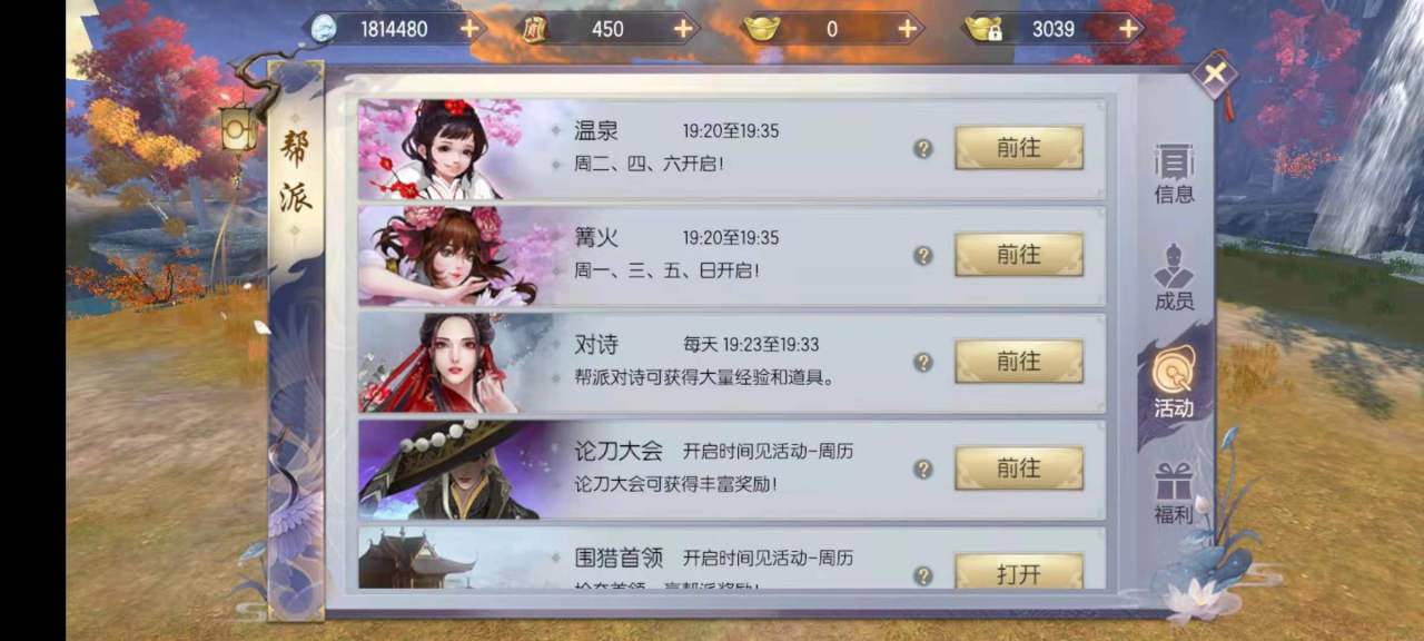 帮派中的活动主要有温泉,篝火,对诗,论刀大会,围猎首领等,这些活动有的是全天开放的,有的则是限时活动,所以我们可以对一些限时活动进行在线提醒,这样帮派成员就不会经常错过活动了,自然活跃度就会高一些。