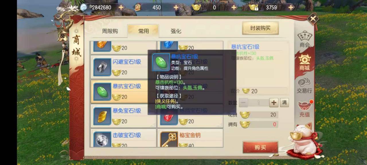 腰带可以镶嵌的是击破宝石和暴击宝石,和项链一样全部选择暴击宝石,靴子可以镶嵌的是闪避宝石和暴免宝石,暴免宝石的效果是降低被暴击时的伤害,闪避宝石是直接闪避一次攻击。两者相比较,枫还是选择闪避比较科学一些。头盔上可以镶嵌的是暴抗宝石和命中宝石,建议大家选择命中宝石,因为暴抗确实有些不靠谱,还不如命中实在。玉佩上可以镶嵌的是爆伤和暴抗宝石,建议选择的是暴伤,戒指上可以镶嵌的是伤害宝石和闪避宝石,建议选择闪避宝石。