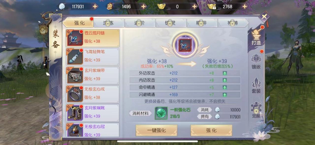 在装备界面,玩家可以给固定的装备进行强化,强化之后,该装备的各方面属性都会得到一个提升,除了使用强化石进行提升之外,玩家还可以给这些装备镶嵌宝石,在装备界面的最右侧第二个就是镶嵌模板了,打开之后选择自己想要镶嵌的装备,选择固定的宝石就可以了。