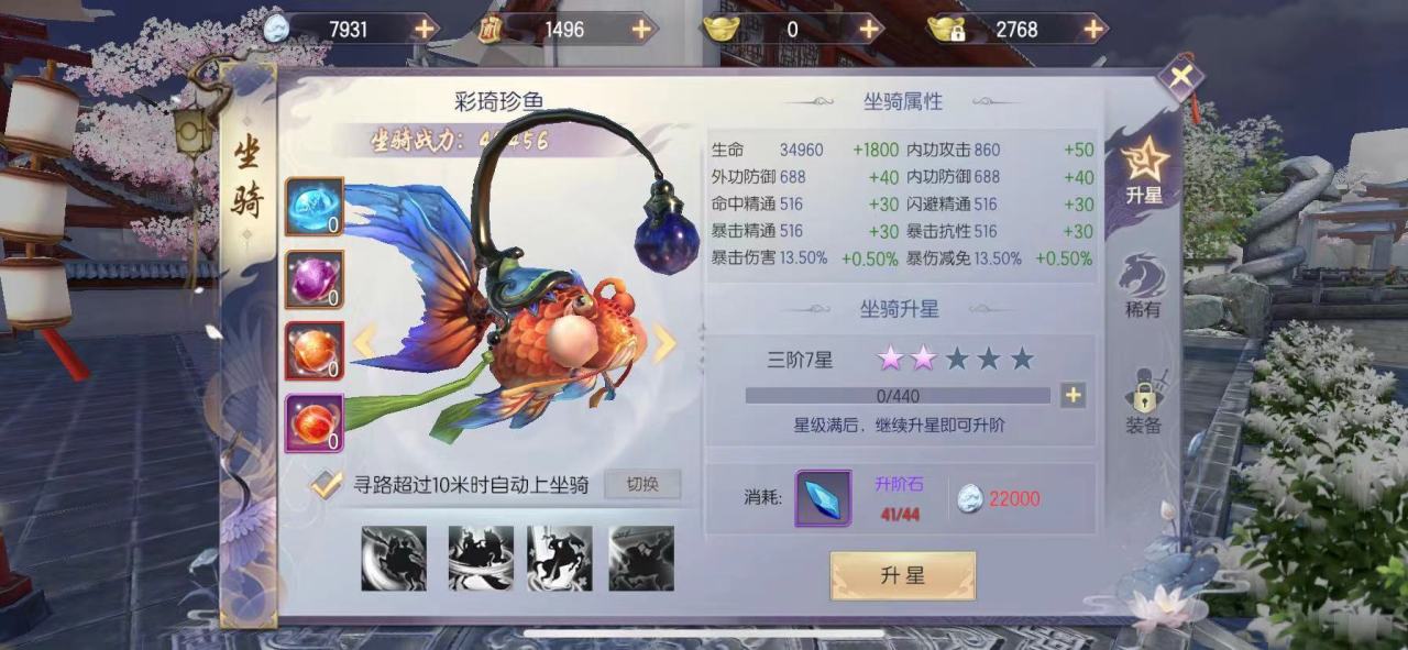 而且这个金鱼坐骑在获取的一开始就是一个二阶坐骑,它的属性也是能完美的继承照夜白麟的属性,这一点真的非常不错,玩家不需要再对其进行额外的升级,只需要保证认真做前期的系统任务就可以了,而且当坐骑达到一定的星阶之后,也是能激发额外的被动技能,这也将为玩家在对战中提升不少的战力。