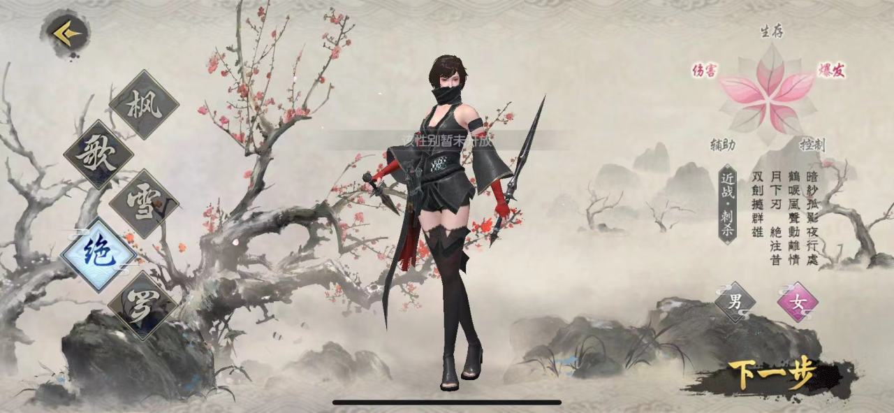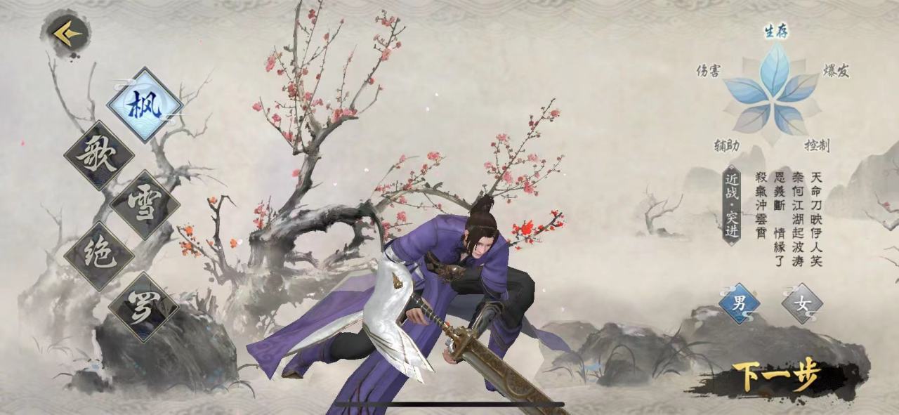 游戏内一共有五种职业,除了罗之外,还有枫、歌、雪以及绝,每个职业都是带有不一样的技能,枫这个职业是个男性角色,一个帅气的小哥哥,它的武器是一把刀,技能为生存、伤害,简单来说就是一个前排角色,类似于坦克一样的存在。