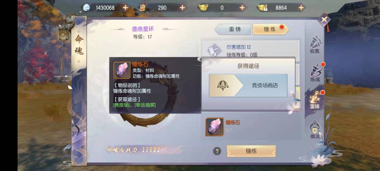 所以一般在锤炼之前都需要先进行重铸,因为初始的属性不一定是我们需要的属性,当重铸完成,属性已经比较完美之后再进行锤炼,重铸中如果发现很好的属性,就先锁定住,不然消失了就后悔了。锤炼需要消耗锤炼石,锤炼石是在竞技场商店中才能购买到的,所以也是非常珍贵,在前期也是无法把所有的命魂属性都锤炼到满级,所以也要有所取舍。在之前的文章中小编给大家推荐过适合罗使用的命魂,有如意葫芦、百变神骰、逍遥小白等等。