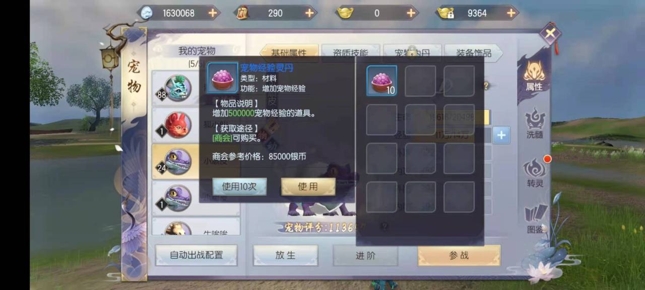 宠物想要获得战斗力,升级是必不可少的,无论是出战或是转灵,都是需要等级的支撑才能看得到属性,但是只有出战宠物能获得一些战斗经验升级,那些无法出战的宠物,或是获得了新的宠物需要培养的话,就只能是使用经验丹来进行升级了。