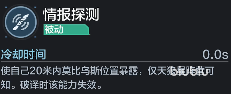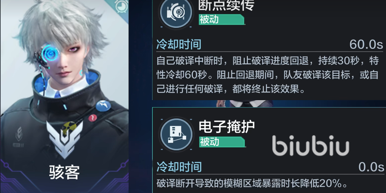 破译型各位玩家们一听就知道了,属于是“修机位”了,骇客的技能为“断点续传”,当破译因为莫比乌斯们的骚扰而中断时,可以阻止破译进度的倒退哦!大大提升了天狼星们的破译效率,电子区域则可以完美地降低百分之20的模糊区域暴露时间,让莫比乌斯们无法准确地追踪到我们的具体位置,为队友们减轻了生存压力。