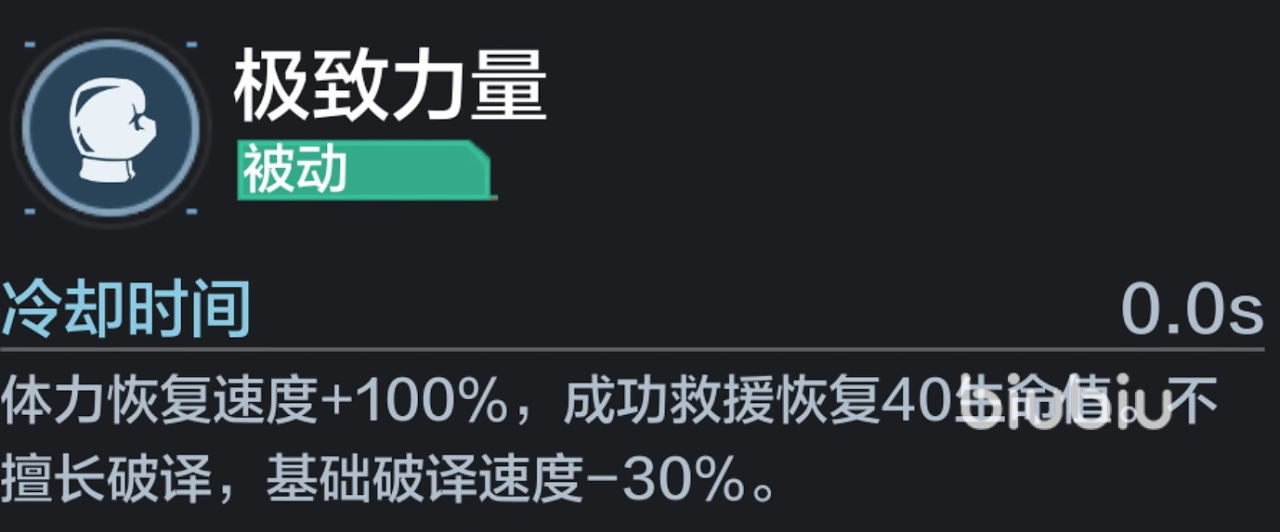 支援型被各位玩家们称为“支援型的各个都是人才”,可见他们的趣味性了,救援队的被动技能为“便携自救设备”,在自己的生命值跌到一定程度的时候,可以为自己套上一层40生命值的护盾7秒,也即可以让自己多扛一次莫比乌斯们的攻击哦!二技能紧急支援则是加快自身的体力回复,跑向受伤的队友还能加速,可以说无愧于“救援队”之名了。至于拳击手则是初始生命值140,比别人多40点!可谓是超级的肉了!另一个技能则为“极致力量”,救援成功可以恢复40的生命值,但是破译的速度要减慢30%,可以说相比于救援队,拳击手是一把双刃剑了,毕竟破译的速度降低了30,最好的游玩方式就是去掩护队友,帮助队友挡刀。救援型的推荐道具为救救鸭以及棒球烟雾弹,毕竟支援型主打的就是救援嘛!