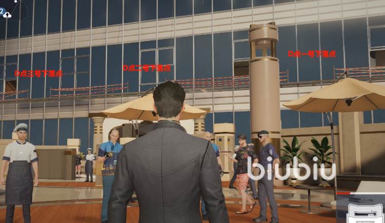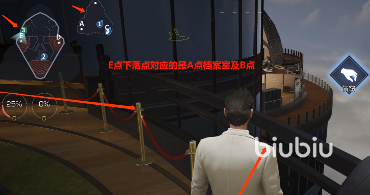 首先大家要选择好自己的出生地点,这时候最好选择在1楼的a点,之后为了快速撤离,可以先将自己的目光看向2楼的E点窗户走廊。之后就可以看到两个下落点,方便可以前往楼梯管理处以及厨房管理处。