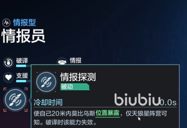 她的一技能叫做情报探测,从名字上就可以看出是拦截周围的情报。由于这个角色属于天狼星阵容,所以用了之后可以发现周围20m之内追击方的行踪,之后你就可以将这个情报告诉给你的队友,让她们及时撤离原来的位置。