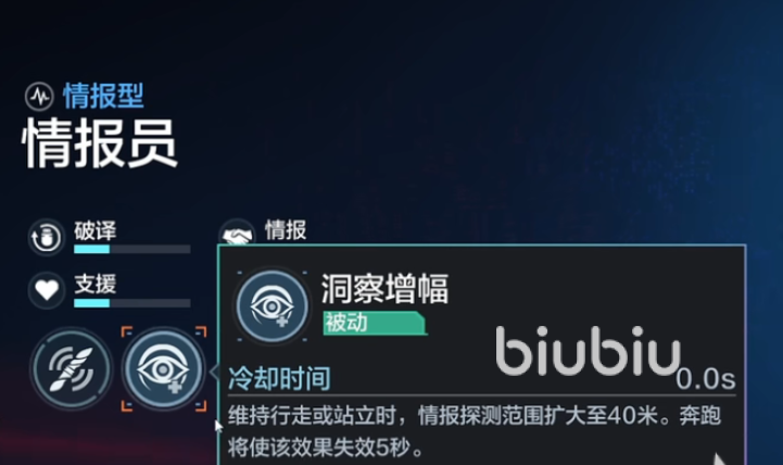 另外一个技能使用之后可以提升一技能的效果,可以把原来是20m的侦查范围建议扩充至40m,这样就更有把握了,可以了解敌人的位置。只不过在快速移动的时候用不了这个技能,所以还要看情况使用。