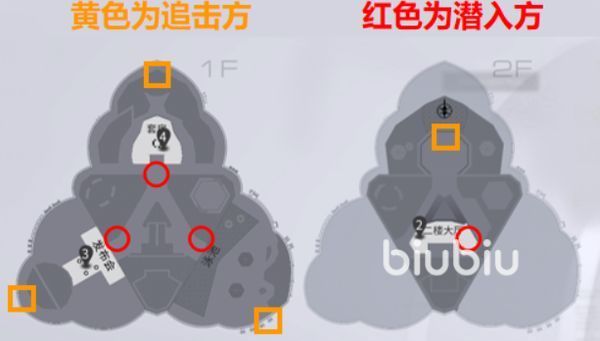 在这个游戏中,双方阵容都有四个出生点,如下图所示,黄色的是追击者,也就是莫比乌斯阵营,红色的为潜入者,也就是天狼星阵营,大家要在天狼星输入四个正确密码将逃生之门开启之前淘汰三名以上的天狼星队员,才能获得游戏胜利。