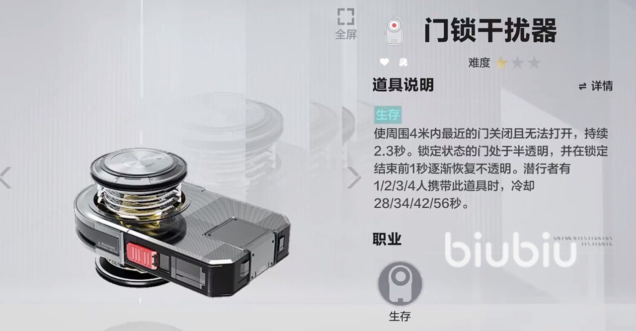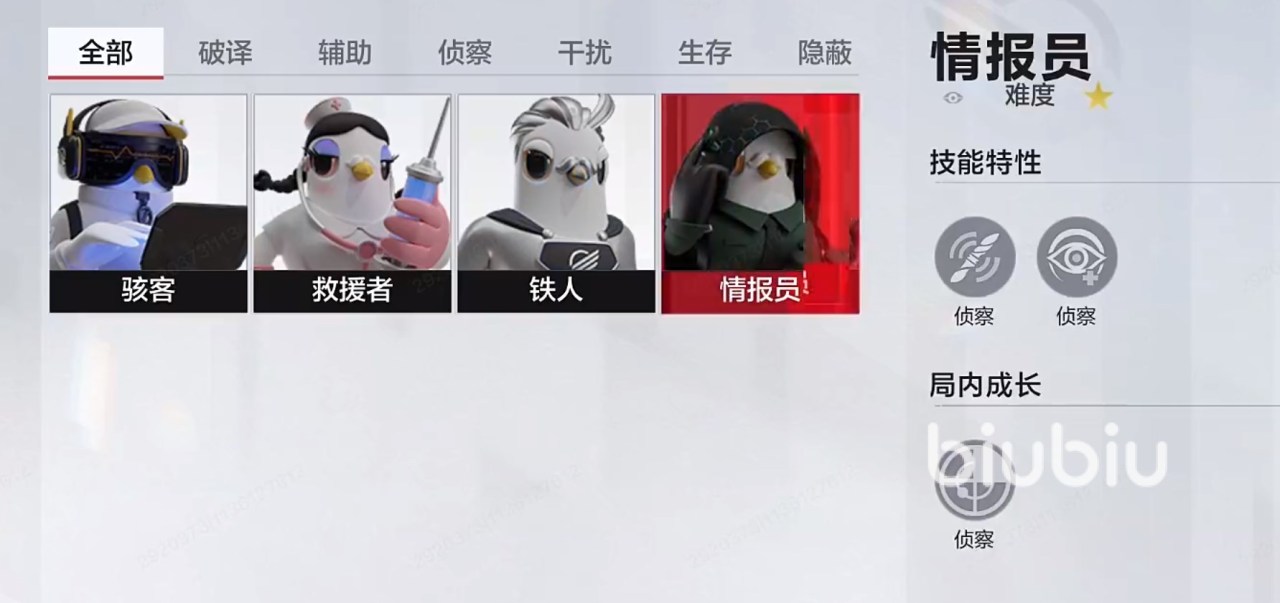 新手比较推荐选“情报员”,特性是收集情报,能定位周围的追击者,不过这个效果在破译密码的时候无效。此外在行走或者站立的时候情报收集范围会扩大,能够有效的在远处伪装,进而躲避追击者的追捕。道具(下文会提)推荐用“门锁干扰器”和活动入手的“隐身盾牌”这两个道具都非常适合情报员,能有效躲避追击者。