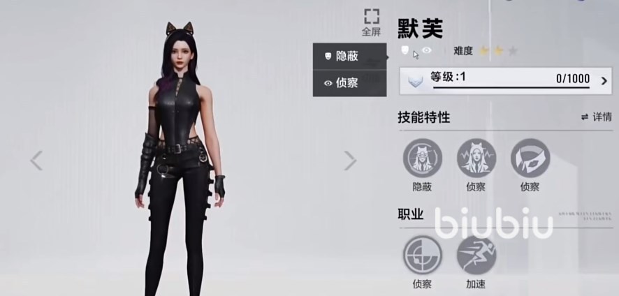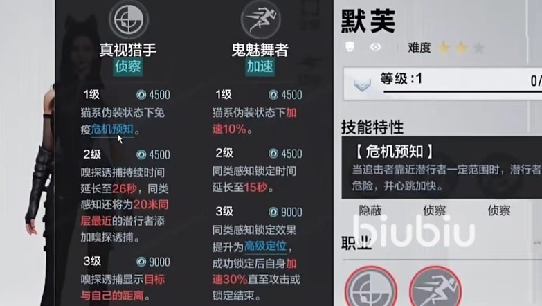 还有就是默芙最核心的技能,可以通过长按来选择除了队友外的任意人员目标,直接伪装成对方的,期间只要不攻击就不会暴露位置,如果有哪个倒霉的潜行者想要对你使用背击,则可以直接给予反击。除此之外,这个角色还有职业属性,可以提升侦查或者加速能力。